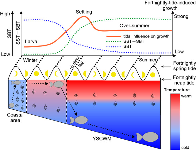 5月31日,国际权威海洋学杂志Journalof Geophysical Research: Oceans 发表了黑料网 渔业海洋学实验室李建超副教授关于潮流作用影响黄海太平洋鳕幼鱼生长的最新研究成果“Tidally induced temporal variations in growth of young-of-the-year Pacific cod in the Yellow Sea”。该研究通过多学科交叉的研究方法,探究了潮流对鱼类生长和黄海生态系统的重要作用。
