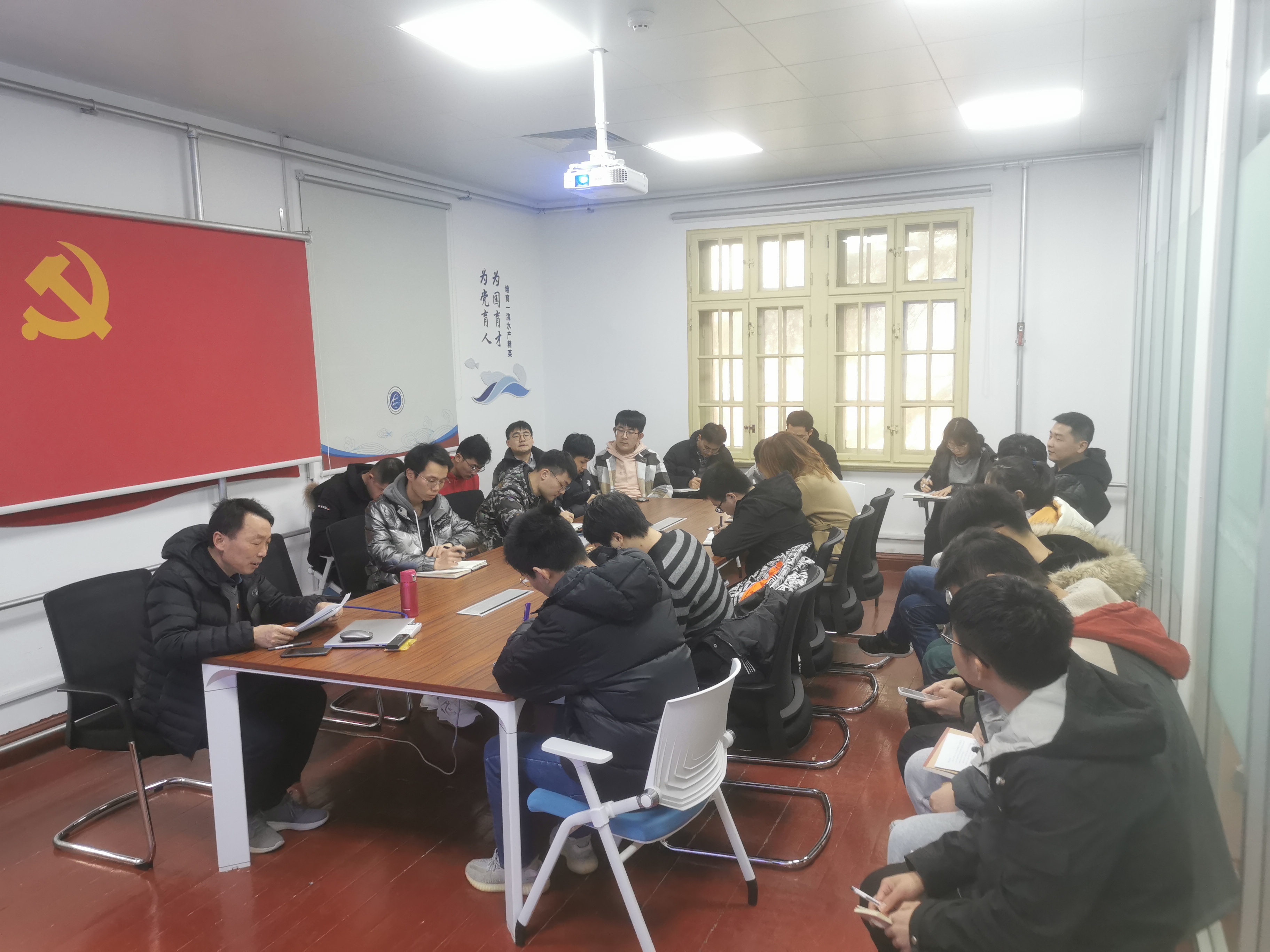 2021年12月16日,黑料网 渔业系主任黄六一教授为2019级渔业资源硕士研究生党支部学生党员讲授题为“学习六中全会精神,奋力开创水产领域新篇章”党课。会议由党支部书记韩康康同志主持,2019级水产养殖硕士研究党支部部分党员同志列席参与。