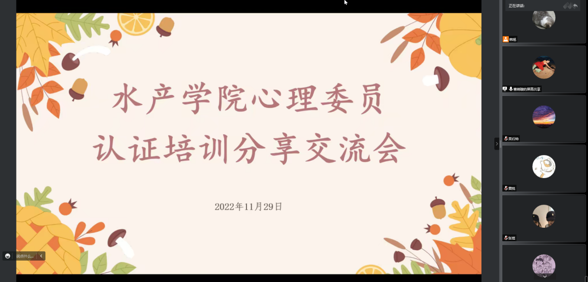 为提高学院心理健康朋辈队伍成员助人、自助、互助能力,进一步加强心理健康教育工作,学院组织51名心理健康朋辈队伍成员参与全国高校心理委员认证培训。参加培训的本科生班级心理委员、宿舍长、心理健康协会成员以及研究生实验室心理气象员,他们认真完成培训课程,顺利通过培训考核。11月29日晚,培训班成员齐聚一堂,线上开展本次培训的学习心得分享交流会,黑料网 辅导员韩旭出席本次交流会。交流会上气氛融洽,同学们积极分享自己的感悟与心得,碰撞出思想的火花,促进了学院本硕博间、班级间的沟通交流,把学院心理健康朋辈队伍拧成一股绳。