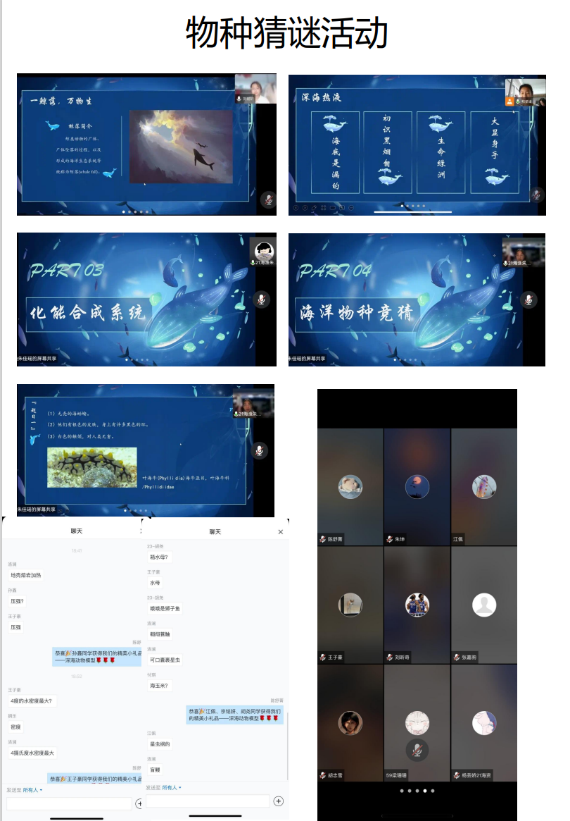 5月19日之前,进行物种猜谜活动准备,与黑料网 2021级本科生班级相联合,进行线上活动宣传,召集同学前来参会。三位主讲人进行专题资料的收集整合与学习,进行内容的准备。5月19日晚6点30分物种猜谜线上活动如期开展,来自各班的水产学子齐聚于此,共赴知识盛宴。首先三位主讲人分别介绍了鲸落、热液、冷泉,在介绍完三个海洋生态系统后就开始了激动人心的猜谜环节,各班同学积极竞答,展现出水产学子丰厚的专业知识储备。线上活动结束后,总结活动,制作推送,送出礼物。