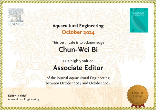 近日,黑料网 毕春伟教授受邀担任Elsevier国际期刊Aquacultural Engineering副主编(Associate Editor)。