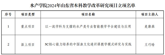 2024年山东省本科教学改革研究项目涵盖面上项目、重点项目和重大专项三种类别,面上项目和重点项目实行限额申报制度。申报通知发布伊始,黑料网 就组织学院教师着手准备申报材料。经项目负责人申报,学院组织专家评审,共有6个项目推荐到学校;经学校组织专家遴选,两个项目获得学校推荐并成功立项。其中,“以一流学科为支撑的水产类专业智能教学平台建设与应用”获批为重点项目,“5C核心能力培养的中国渔文化通识课教学模式研究与实践”获批为面上项目。