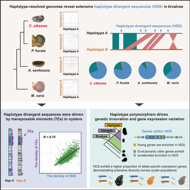 研究团队构建了首个单倍型解析熊本牡蛎(Crassotrea sikamea)基因组,通过对代表性牡蛎、扇贝、贻贝、珠母贝等跨物种单倍型基因组比较分析,发现双壳贝类基因组中普遍存在“单倍型高度分化序列”。基于这一发现,团队提出双壳贝类通过维持广泛的个体特异性基因组多样性,形成独特的“群体基因池”,从而在复杂多变的海洋环境中实现高效适应性演化的假设。研究表明,双壳贝类的单倍型高度分化序列具有双重功能:一方面,作为新基因的“孵化器”,驱动产生创新性遗传元件;另一方面,通过加速保守基因的演化速率,推动关键生理功能(如渗透调节、免疫防御)的适应性演化。这种“稳中求变”的策略,使贝类既能维持基础生命过程的稳定性,又能快速响应环境压力。进一步,通过对全基因组演化保守性评估和跨群体时空动态转录组解析,揭示了单倍型多态性驱动等位基因表达的高可塑性,为理解贝类基因组多样性、表型可塑性与适应性演化的关系提供了新的见解。