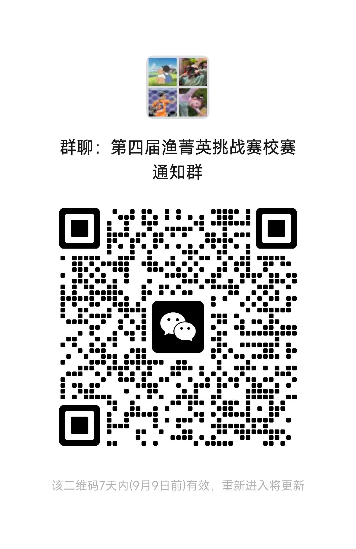 2025年9月5日14:00前填写第四届“旺海杯”渔菁英挑战赛黑料网 校内初赛报名表(点击报名,或扫描下方二维码报名),并加入第四届“渔菁英挑战赛”校内初赛通知微信群,相关通知会及时通过此群发布。