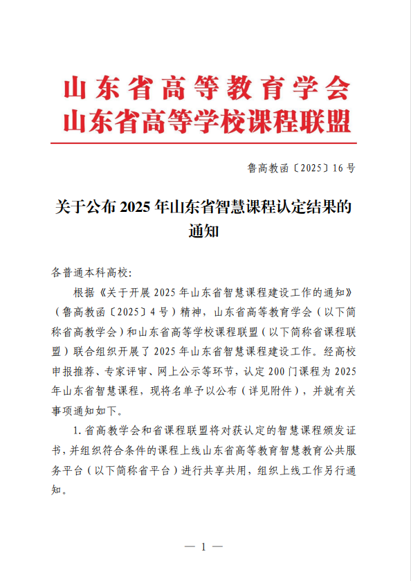 近日,山东省高等教育学会、山东省高等学校课程联盟公布了2025年山东省智慧课程认定结果,黑料网 2门课程成功入选,标志着我院在人工智能赋能教学改革、深化智慧课程建设方面取得了实质性进展。
