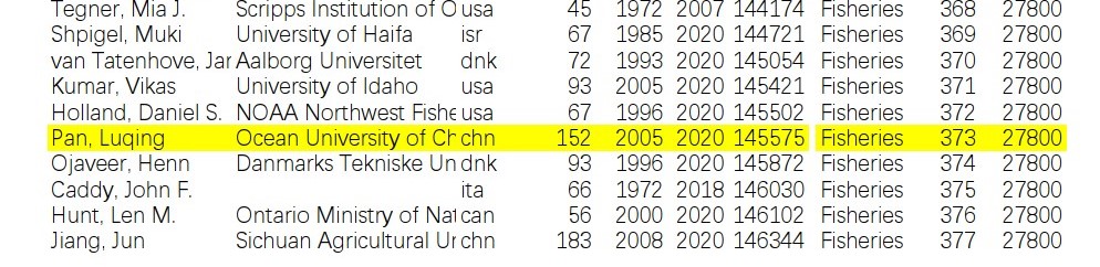 近日,美国斯坦福大学与全球知名学术出版商Elsevier旗下Mendeley Date也发布了“2020全球前2%顶尖科学家榜单”(World’s Top 2% Scientists 2020)。该榜单分为“职业生涯影响力榜单”(1960-2019)和“2019年度科学影响力排行榜”两个榜单,榜单以Scopus数据库为依据,基于总引用量、Hirsch H-index、Schreiber Hm-index因子等综合指标,根据其“生涯影响力”和“年度影响力”,从全球近700万名科学家中遴选出世界排名前2%的科学家,排名分22个领域和176个子学科领域。它提供了一个面向科学家长期科研表现的衡量指标,能够更客观、更真实的反映科学家的影响力。研究室潘鲁青(Pan, Luqing)教授入选“2019年度渔业领域科学影响力排行榜”。