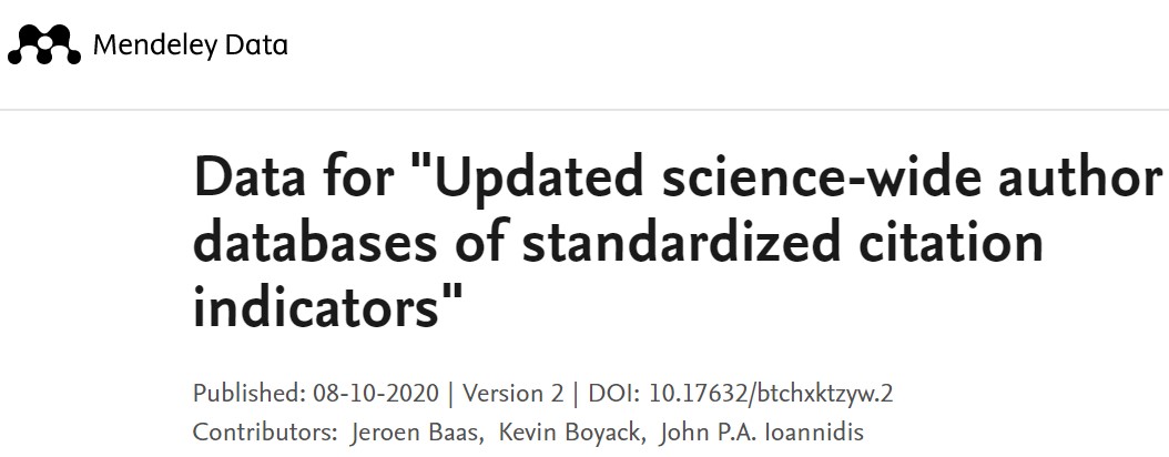 2020年度全球前2%顶尖科学家榜单://data.mendeley.com/datasets/btchxktzyw/2