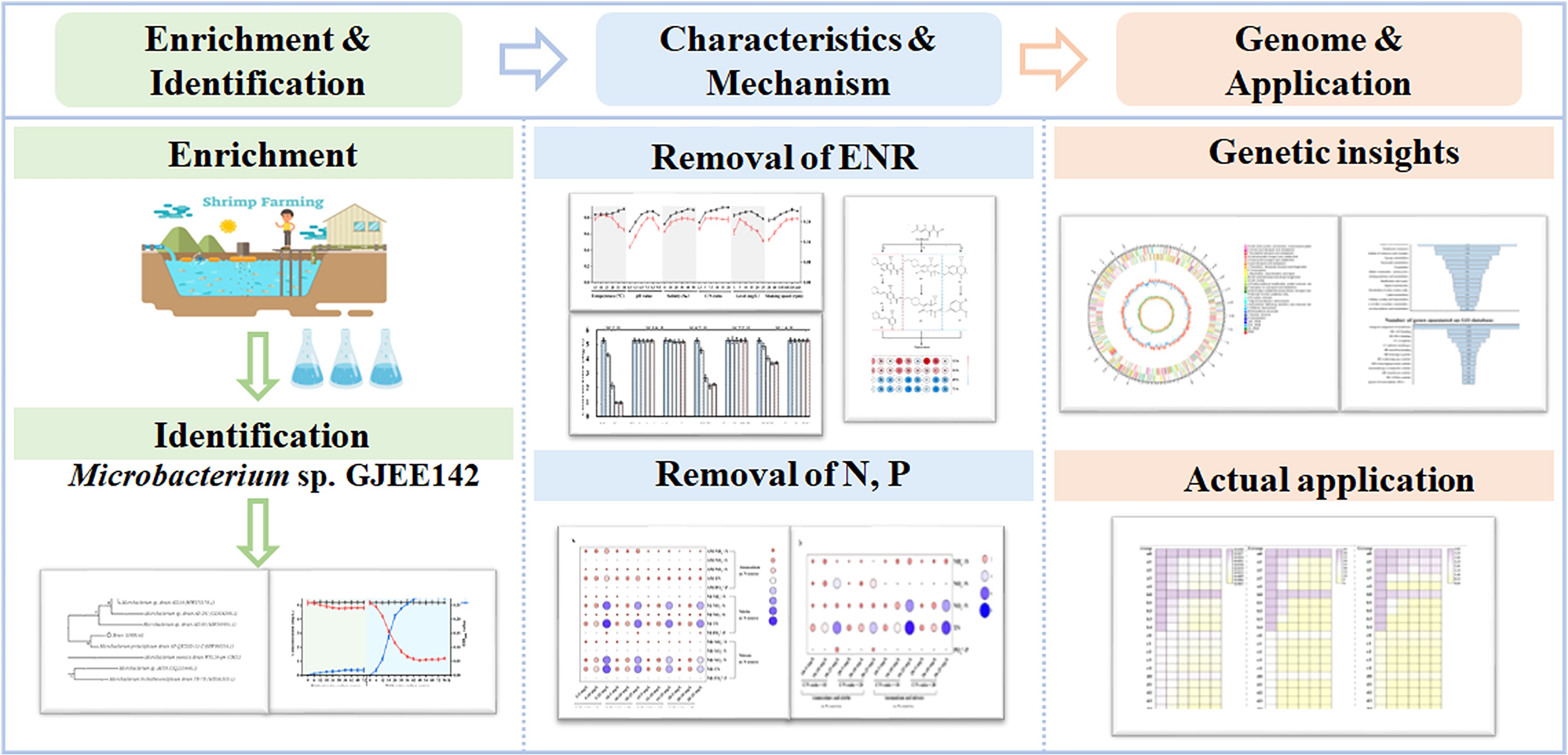 本研究从对虾池塘养殖环境中分离得到一株高效恩诺沙星降解菌株(Microbacterium proteolyticum GJEE142),该菌株对环境温度(13-38 ℃)、盐度(10-50‰)和C/N(2-20)具有较强的适应性,同时还具有高效的脱氮、除磷功效,并从降解方式、降解途径、基因解析等方面阐明了该菌株对恩诺沙星、氮和磷的去除机制。应用实验表明该菌株对水产养殖尾水和生活污水中的恩诺沙星、氮、磷具有良好的去除效果。研究成果不仅全面解析了恩诺沙星的微生物降解机制,也为水产养殖环境和生活污水中恩诺沙星和氮、磷污染消除提供了技术支持。