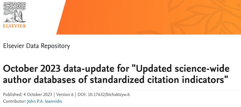 2023104日,全球知名学术出版商Elsevier旗下Mendeley Data与美国斯坦福大学John R.A. Ioannidis教授团队更新了标准引文指标的全科学作者数据库,发布了第六版《全球前2%顶尖科学家榜单2023(World’s Top 2% Scientists 2023),该榜单从近7百万科学家中,筛选出世界Top 2%的科学家,包括了22个领域和174个子学科。该榜单从科学家视角多维展示了科研状态,提供了一个面向科学家长期科研表现的衡量指标,更客观、更真实地反映了科学家的影响力。
