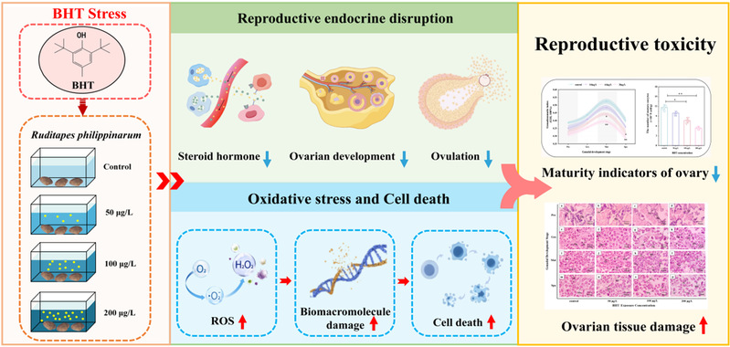 菲律宾蛤仔(Ruditapes philipinarum)主要分布于西太平洋、欧洲温带和我国沿岸海区,在食物网和生态循环中发挥着重要作用。本研究选择2,6-二叔丁基-4-甲基苯酚(BHT)作为典型SPAs,设置0、50、100、200μg/L BHT染毒梯度,探究了BHT对生殖期雌性菲律宾蛤仔的生殖毒性机制。结果表明,BHT干扰了卵巢类固醇激素合成和雌激素受体基因的表达,性激素含量显著下降,表现出明显的抗雌激素效应;BHT能抑制原始生殖细胞发育、卵子的形成过程,并通过缺氧诱导因子和金属裂解酶阻碍卵子排出,最终造成性腺指数和成熟卵母细胞数显著降低。同时BHT胁迫诱导卵巢ROS水平明显升高,造成生物大分子损伤效应,卵巢细胞凋亡、焦亡、Fe2+死亡增加,组织结构严重受损。本研究首次阐明了SPAs对水生无脊椎动物生殖毒性的分子机制,为海洋生物资源保护和SPAs污染监测提供了科学依据。