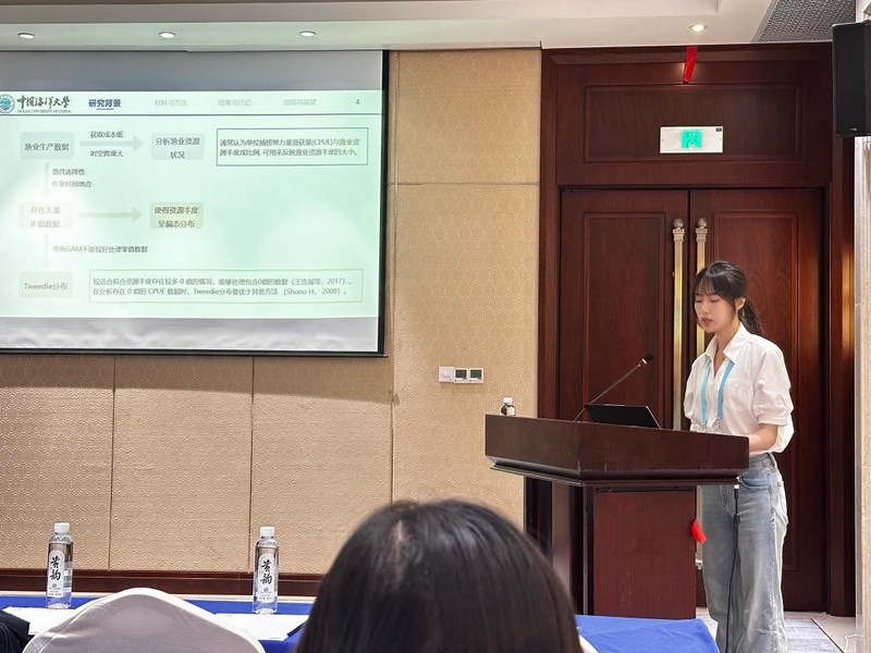 姜月进行《山东近海金乌贼渔场分布及其与捕捞压力和环境因子的关系》的报告