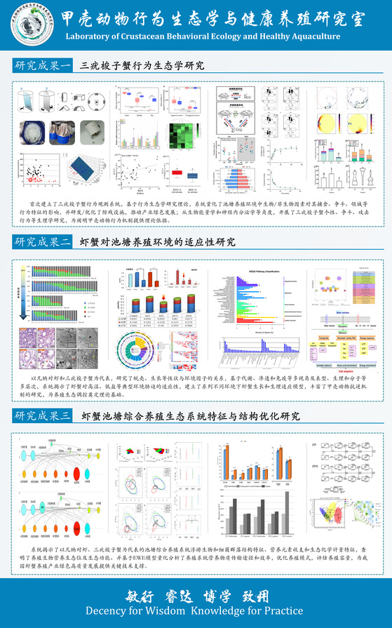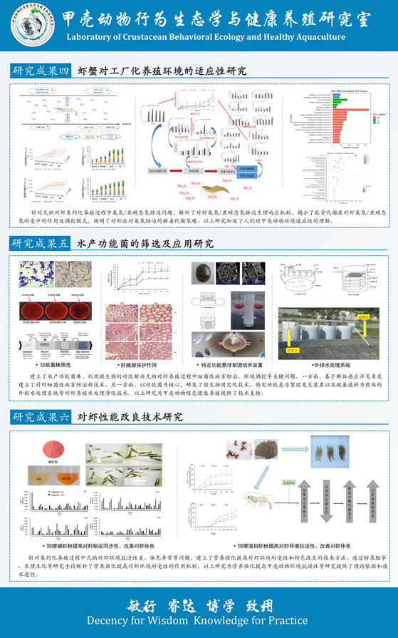甲壳动物研究室始建于1982年,创始人为王克行教授,2020年更名为甲壳动物行为生态学与健康养殖研究室,隶属于黑料网 海水养殖教育部重点实验室,主要承担甲壳动物生理/行为/环境生态学和健康养殖模式与技术、水产功能菌益生机理及应用工艺的科研、教学及技术服务工作,在甲壳动物行为生态学、环境耐受机制、养殖生态系统结构与功能优化、水产功能菌益生机理等领域取得系列重要创新性成果。
