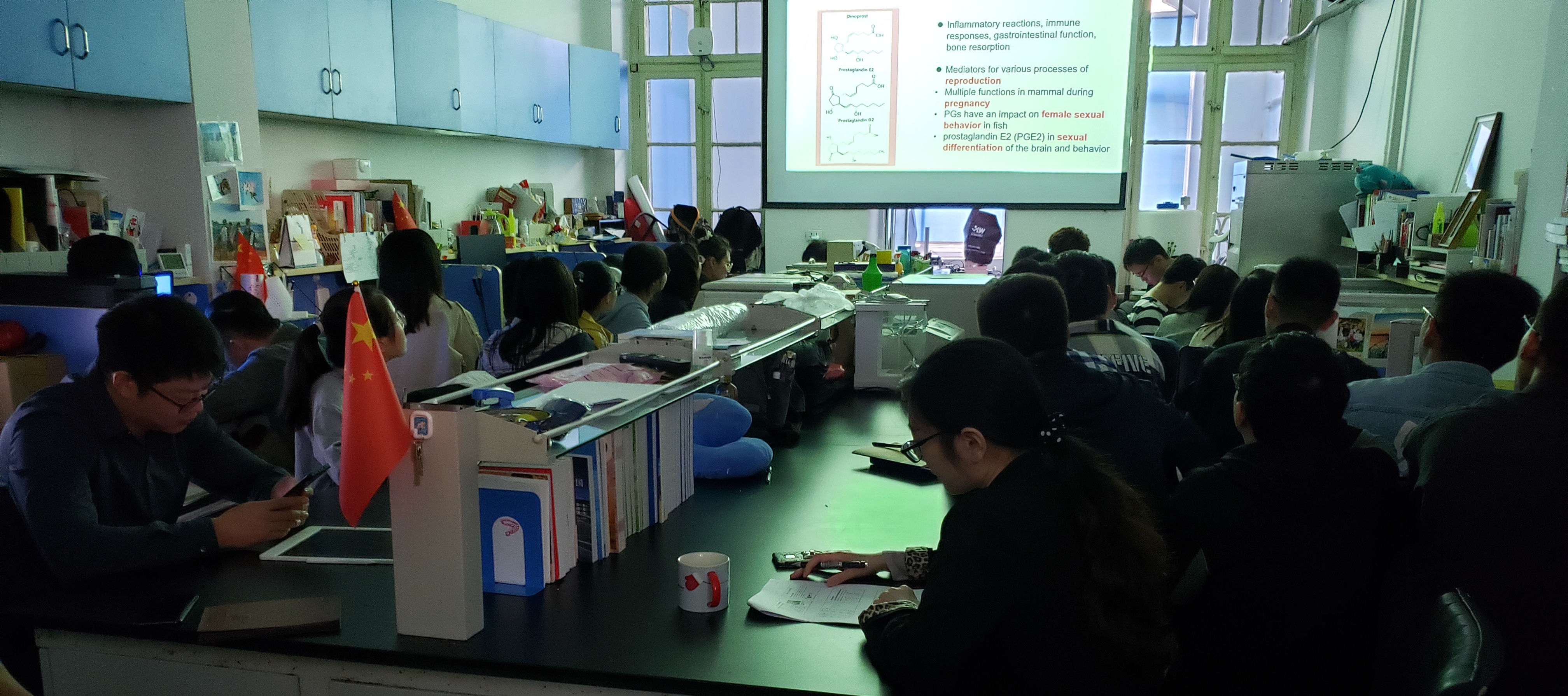 10月9日,鱼类繁殖生理与种子工程实验室文献分析会议如期召开,实验室全体师生参加会议。 会上,三位博士研究生分别做了文献分析报告,将优质文献进行分析、解读,与大家一同分享、讨论。首先研究生吕里康做了主题为“爱的荷尔蒙,海洋中的浪漫气息——第四部分:前列腺素与排卵”的报告,他通过对多篇文献内容的解读,向大家介绍了前列腺素在排卵过程中的作用机制。随后,研究生刘冰花对文献《m(6)A demethylase ALKBH5 maintains tumorigenicity of glioblastoma stem-like cells by sustaining FOXM1 expression and cell proliferation program》进行了分析、汇报,她从研究思路、研究方法、实验结果与讨论等方面对文献进行了解读。最后,研究生王孝杰做了主题为“Functions of IL-1β in regulating synthesis of Glucocorticoids and prostaglandins”的报告,他从IL-1β与糖皮质激素、IL-1β与前列腺素、IL-1β与生殖调控三个方面展开汇报,介绍了IL-1β的作用机制。 通过本次文献分析会议,让大家了解了更多的生理学知识、更先进的研究方法和研究思路,提升了大家的科研思维,对日后科研工作的开展大有裨益。