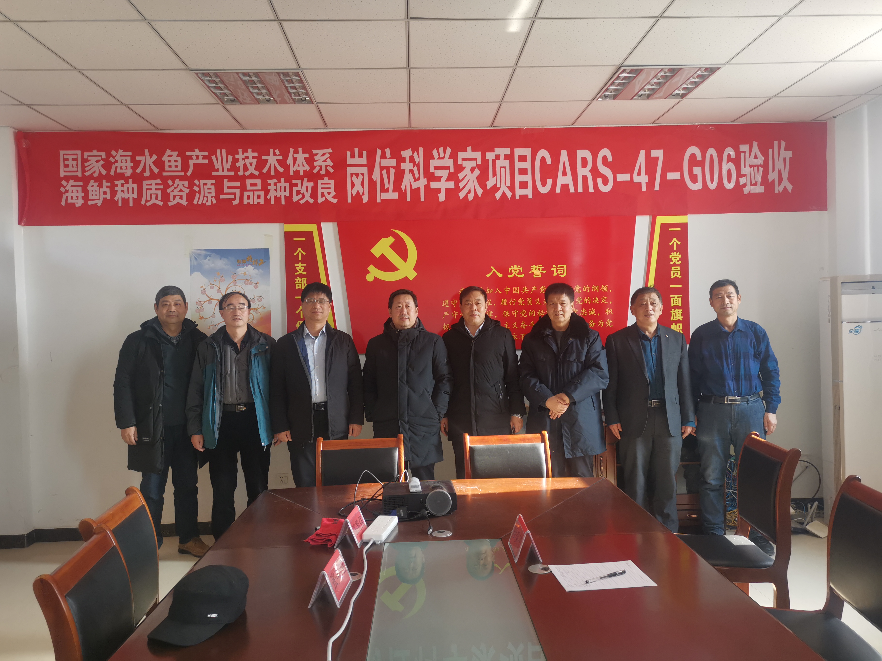 温海深教授、张美昭高级实验师、张凯强实验师;利津县双瀛水产苗种有限责任公司陈守温总经理、王旭副总经理、徐扬涛主任。
