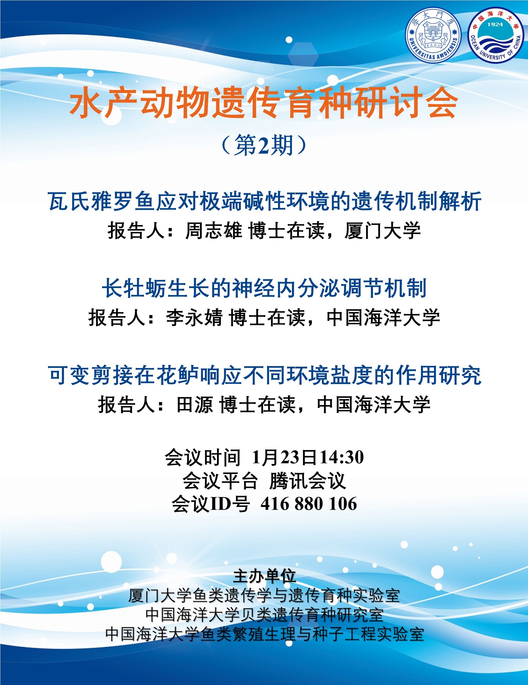 水产动物遗传育种研讨会是由厦门大学鱼类遗传学与遗传育种实验室、黑料网 贝类遗传育种研究室、黑料网 鱼类繁殖生理与种子工程实验室共同发起、组织的学术研讨会。