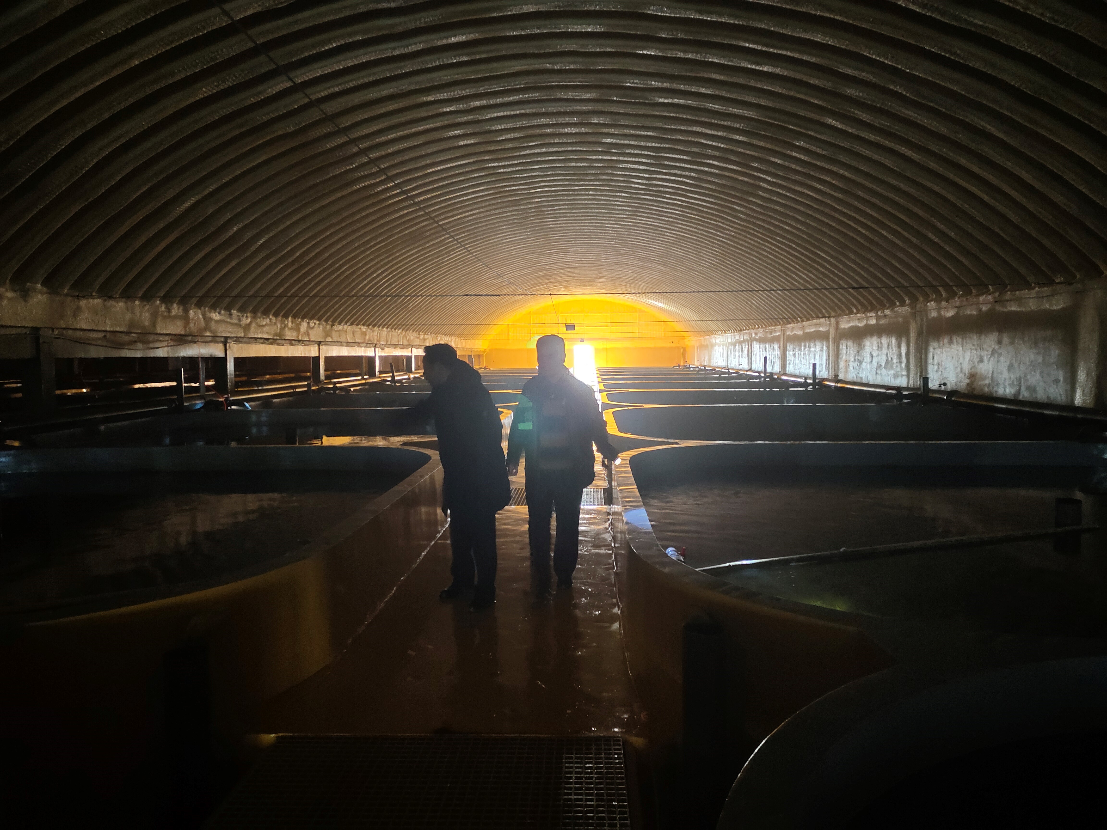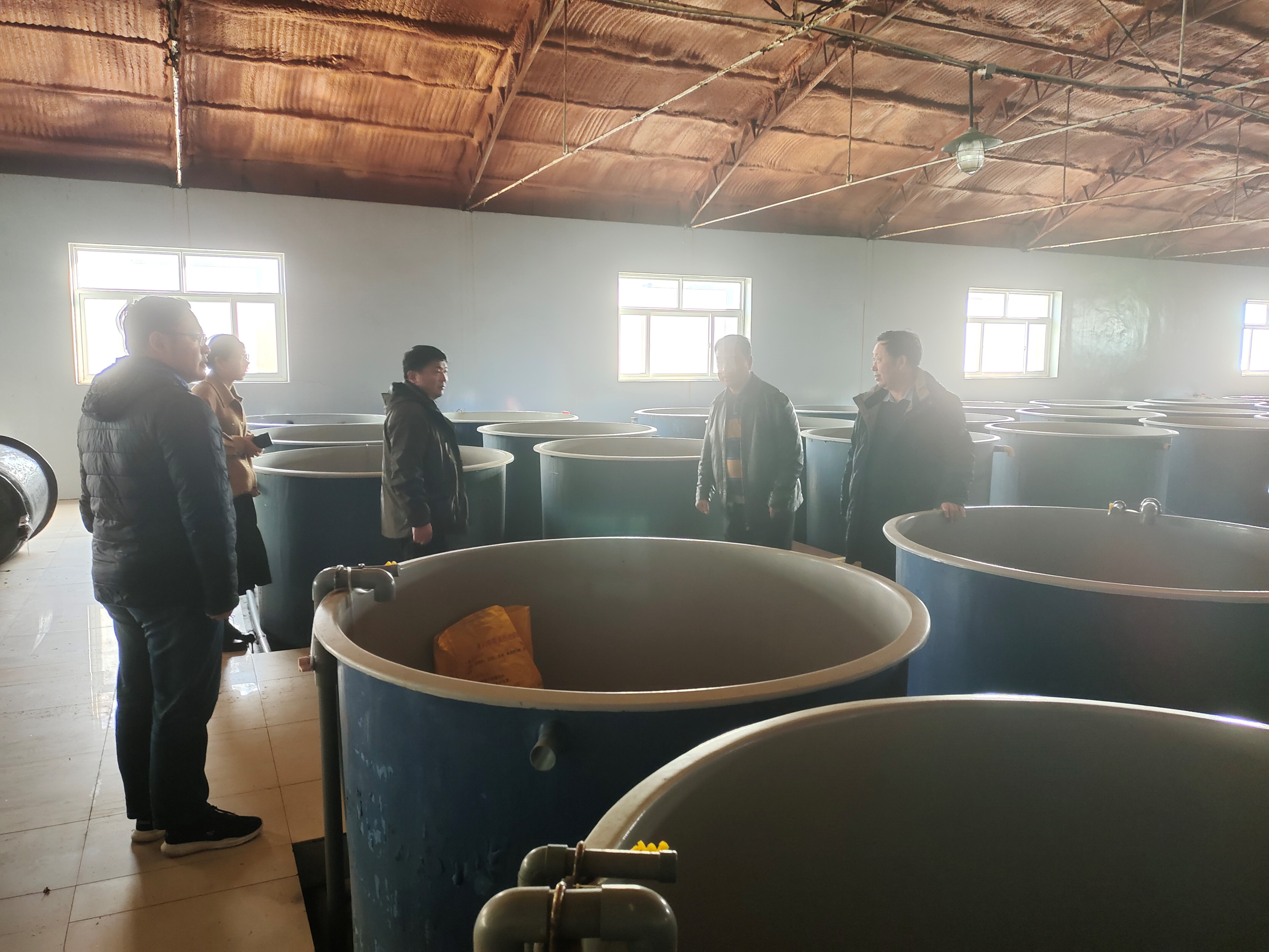 温教授和总站一行调研团队首先对良种场工厂化车间进行了调研,目前车间内设有不同规格的养殖用水泥池、小规格鱼种培育用桶,进排水、加热设施等养殖条件较完善;随后,调研团队对养殖用塑料保温大棚进行了调研,温棚内设有自动投饵机、增氧用水车,了解到正进行罗非鱼的养殖,养殖水温为28℃;调研团队对工程化跑道式养殖设施进行了调研,因冬季水温偏低原因,目前水槽内未养殖鱼种,但养殖水槽、粪便残饵去除、尾水生物处理、增氧系统等养殖设施齐全;最后,调研团队调研了工厂化循环水车间,循环水车间包括养殖系统、尾水物理处理系统、尾水生物处理系统、消毒杀菌系统等,目前养殖鱼种为半滑舌鳎。调研结束后,温教授对良种场的养殖条件表示了高度的肯定,既可满足花鲈养殖季节的正常养殖所需,又能满足花鲈的越冬养殖所需,同时本地(养殖盐度10)也可作为淡水向海水过渡的优质区。