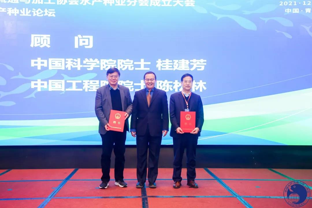 桂建芳院士为分会副会长中水集团远洋股份有限公司、渤海水产股份有限公司、海南晨海水产有限公司、大连棒棰岛海产股份有限公司、青岛国信蓝色硅谷发展有限责任公司、安徽富煌三珍食品集团有限公司颁发证书;