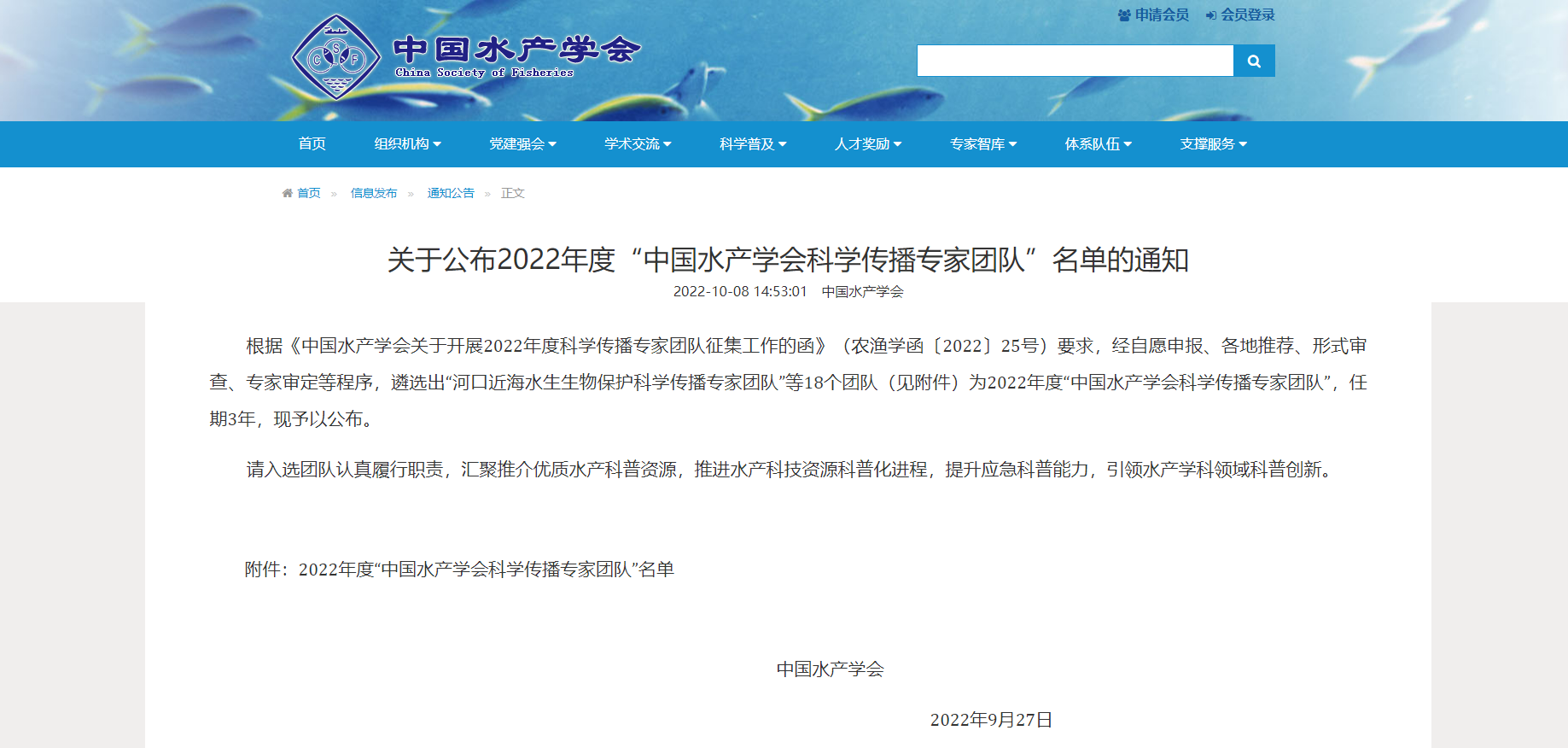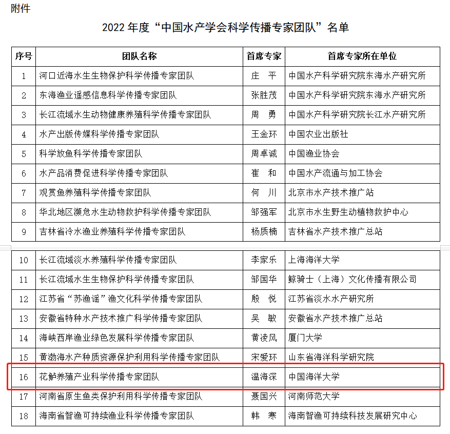 2022年9月27日,中国水产学会公布 “中国水产学会科学传播专家团队”名单,以温海深教授为首席专家的“花鲈养殖产业科学传播专家团队”入选。 根据《中国水产学会关于开展2022年度科学传播专家团队征集工作的函》(农渔学函〔2022〕25号)要求,经自愿申报、各地推荐、形式审查、专家审定等程序,中国水产学会遴选出“河口近海水生生物保护科学传播专家团队”等18个团队为2022年度“中国水产学会科学传播专家团队”,任期3年。日前,中国水产学会印发《关于公布2022年度“中国水产学会科学传播专家团队”名单的通知》(农渔学函〔2022〕142号),公布了科学传播专家团队名单。