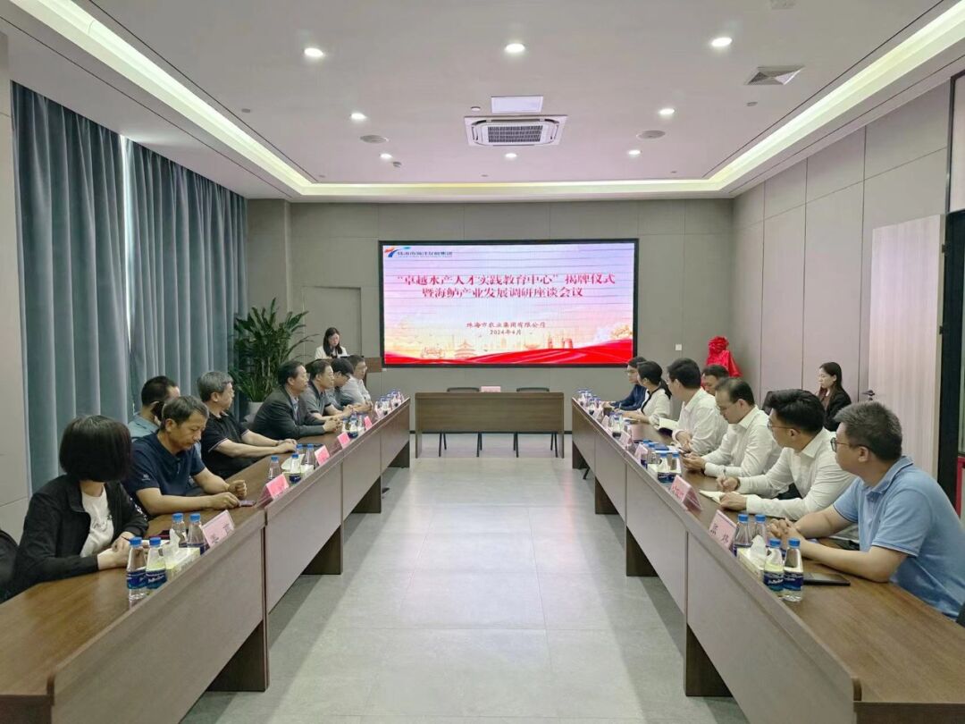 郑志坚董事长、温海深教授、林卿叶总经理助理、齐鑫教授 共同为“卓越水产人才实践教育中心”揭牌 签约与揭牌之后,农业集团林卿叶总经理助理同下属珠海白蕉海鲈产业中心有限公司团队,与国家海水鱼产业技术体系岗位科学家团队在现场进一步开展海鲈产业发展调研座谈交流。双方就海鲈苗种、水环境调控、养殖技术等方面的发展现状、存在问题及发展前景进行热烈讨论。同时,结合白蕉海鲈产业公司战略规划与重点项目建设情况,双方深入探讨在海鲈苗种、水产养殖方面的合作机会。 此次“卓越水产人才实践教育中心”签约与揭牌仪式,标志着双方以“水产种业、健康养殖、海洋牧场、休闲渔业”等领域产学研合作正式拉开了序幕,是海洋集团、农业集团进一步深化海洋产学研平台建设的重要举措,通过科教融合、产教协同,共谋海洋产业专业技术骨干队伍培养,加快技术成果转化应用,共同助力珠海建设特色型现代海洋城市。国家海水鱼产业技术体系岗位科学家团队;农业集团常务副总经理肖楠、副总经理廖克政、总经理助理喻俊凯参加签约及揭牌仪式。 仪式结束之后,专家们考察了珠海市海鲈相关企业。