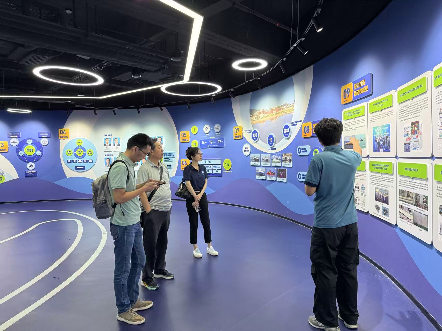 参观南方海洋实验室科普馆 8月19日上午,温海深教授一行前往农发中心进行参观交流,农发中心沈汉国主任、农发中心现代渔业研究所刘文所长、农发中心现代渔业研究所李勇副所长、农发中心现代渔业研究所何瑞鹏博士、农发中心科技管理及成果转化部罗志平副部长全程陪同。首先,李勇副所长和何瑞鹏博士陪同温海深教授一行对病害实验室进行了参观。参观后,双方进行了座谈。座谈会上,沈汉国主任对温海深教授一行表示热烈欢迎,对双方2024年度开展的花鲈本地化实验表示肯定,并指出2025年度将在总结经验教训的基础上继续开展本地化花鲈繁育研究,希望温教授团队继续支持。随后,何瑞鹏博士对农发中心基地保存花鲈亲本数量、基地设施设备、2024年度苗种培育失败原因、2025年度繁育计划进行了分享。农发中心基地保有4龄亲本800尾、3龄亲本200尾,基地建有16口池塘(100亩)、工厂化和循环车车间。最后,温教授表示将继续和农发中心保持紧密合作,需提前做好2025年度花鲈本地化繁育方案,重点关注雄鱼精液活力测定、生物饵料衔接等方面。