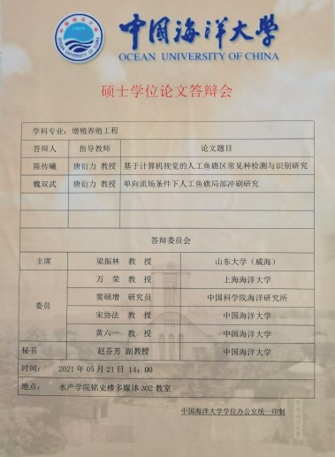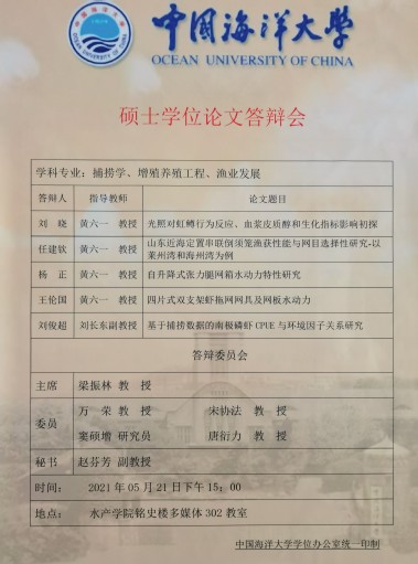 2021年5月21日下午,海洋渔业技术实验室在档案馆多媒体教室举行了2021届研究生毕业论文答辩。答辩委员会由山东大学威海分校海洋学院常务副院长梁振林教授、上海海洋大学校长万荣教授、中国科学研究院海洋研究所窦硕增研究员、黑料网 副院长宋协法教授、黑料网 唐衍力教授、黑料网 渔业系主任黄六一教授组成,其中,梁振林教授担任答辩委员会主席。赵芬芳副教授担任答辩委员会秘书。