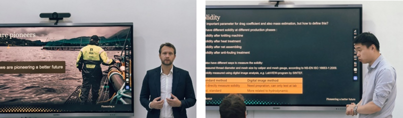 10月27日,Hosaas总监到访黑料网 海洋渔业技术实验室,参加国际合作导师的受聘会议。会议伊始,黄六一教授致欢迎词,通过宣传片全面展示了学院的发展历程和海洋渔业技术实验室的科研成果。在随后举行的合作导师聘任仪式上,正式聘请Arnstein Hosaas总监为黑料网 合作导师。学术交流与讨论环节,Hosaas总监首先向与会人员分享了挪威AKVA集团的发展历程、市场经营及其在海洋养殖装备与系统研发领域内的前沿技术与创新实践。另外,程晖博士围绕养殖网箱水动力研究的相关内容进行专题报告。最后,黄六一教授则就研究室近年来在海洋牧场、海水养殖装备等相关领域内的研究进展做了介绍。双方就共同关注的深远海养殖网箱装备研发技术难题进行了热烈讨论。