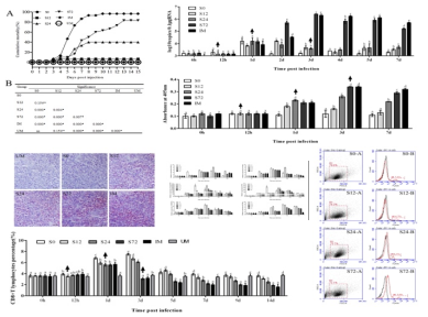 10℃水温下以HIRRV感染牙鲆后0122472 h内将水温升高至20℃。结果显示,在感染后012h升温组死亡率分别为06.67%,低于72h升温组96.67%)。另外,感染后早期升温(01224h)牙鲆的病毒拷贝数明显低于72h升温感染后012h升温的牙鲆脾脏中CD8+T淋巴细胞比例显著高于72h升温。同时,抗病毒相关基因的表达变化揭示早升温可以诱导抗病毒相关基因明显更快、更强的上调。以上结果表明,在HIRRV感染后的早期阶段,将养殖水温从10℃转移到20℃,可以诱导牙鲆鱼快速而强烈的抗病毒免疫反应,对HIRRV感染起到有效的保护作用,证实了可以通过控制水温来有效预防HIRRV爆发