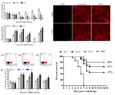 10℃水温HIRRV感染牙鲆并维持2d升温至20℃。感染后7dS-7组)、14dS-14组)或21dS-21组)降温至10℃时死亡率分别为60%13.33%0针对初次感染免疫存活牙鲆再次攻毒结果显示S-21组的存活率为80%,明显高于S-14组(65%)和S-7组(45%)。此外,研究发现,在20℃下维持较长时间的牙鲆的病毒拷贝数较低,在20℃下维持较长时间的存活牙鲆会引起较高IgM + B淋巴细胞比例和特异性抗体水平。结果表明,控温条件下初次感染活HIRRV会引起对该病毒的有效保护性免疫反应,并且在20℃下保持足够长的时间使牙鲆完全清除病毒并获得对HIRRV免疫保护作用因此接种活HIRRV结合水温调控有望成为牙鲆弹状病毒病的有效防控措施