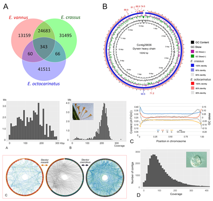 纤毛虫组学及基因进化 主要聚焦海洋养殖危害类群、系统地位特殊类群、环境极端类群等开展组学信息库的构建和分析,并针对其独特的两型核结构,研究其接合生殖过程中的基因组重组模式及机制,并对该过程中所涉及的基因及其功能进行揭示。本工作为真核生物基因组进化及功能基因的研究等提供重要的理论支持和分子生物学信息。